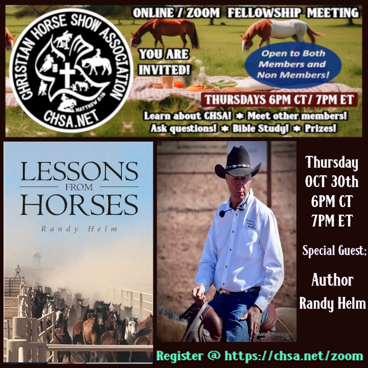 Join us this Thursday 6PM CT / 7PM ET! Pastor and author Randy Helm of Helms Horsemanship will be our special guest for our weekly online / zoom fellowship, bible study and Q&A!