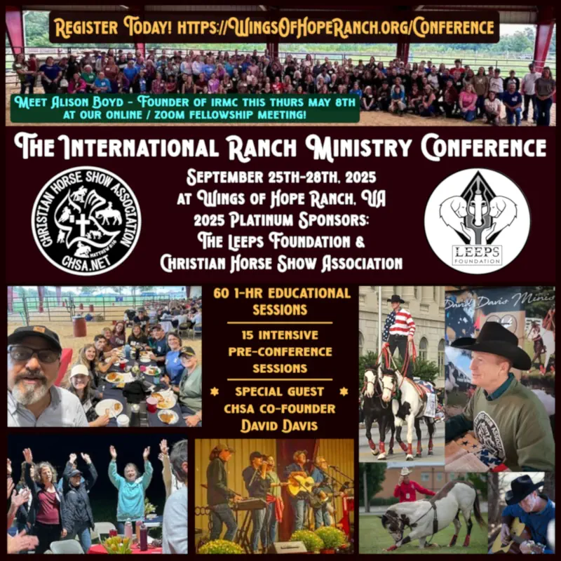Meet Alison Boyd, the founder of the International Ranch Ministry Conference at our online / zoom fellowship this Thursday May 8th! Conference details can be found at https://wingsofhoperanch.org/conference