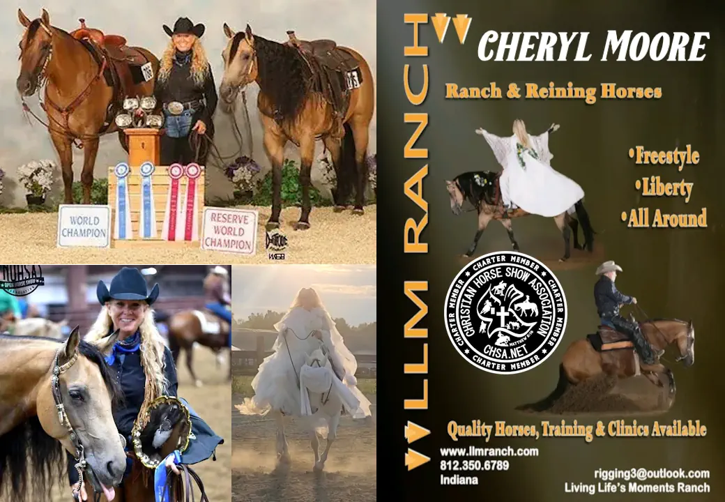 Farming and horses have always been a part of my life. LLM Ranch is very active in Freestyle reining in hopes of sending beautiful messages to others. After over 50 years in the horse industry, with many championships under our belt, we are so Thankful to have met many awesome people and had the opportunity to work with some wonderful horses. We are so Blessed to be helping others find their next great horse. For all we leave when we are gone is what we have done while we are here. Life is very short, so live every moment of it! We are Happy to be a charter member and sponsor of Christian Horse Show Association!