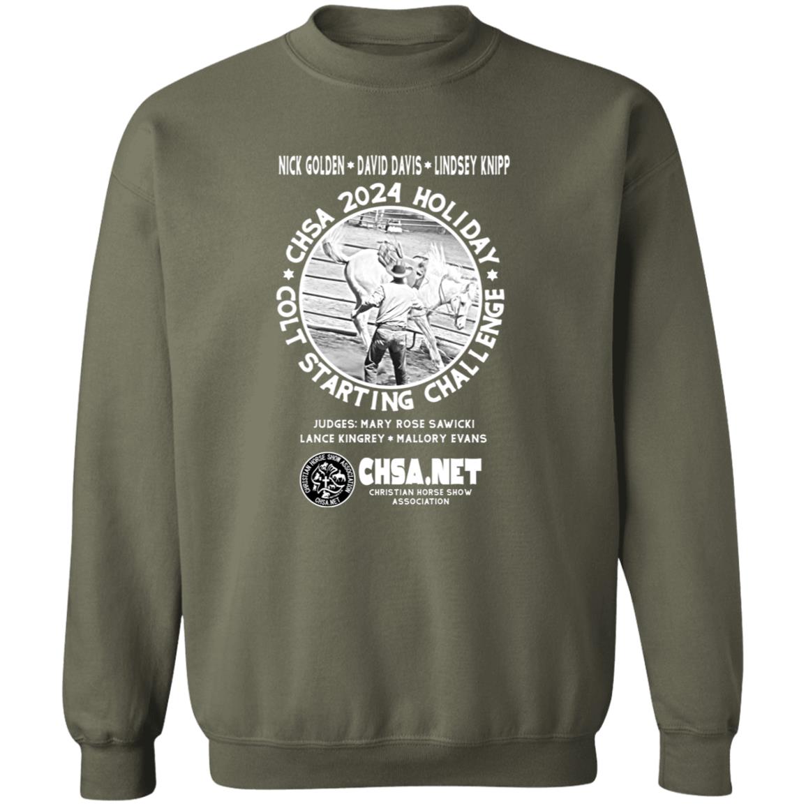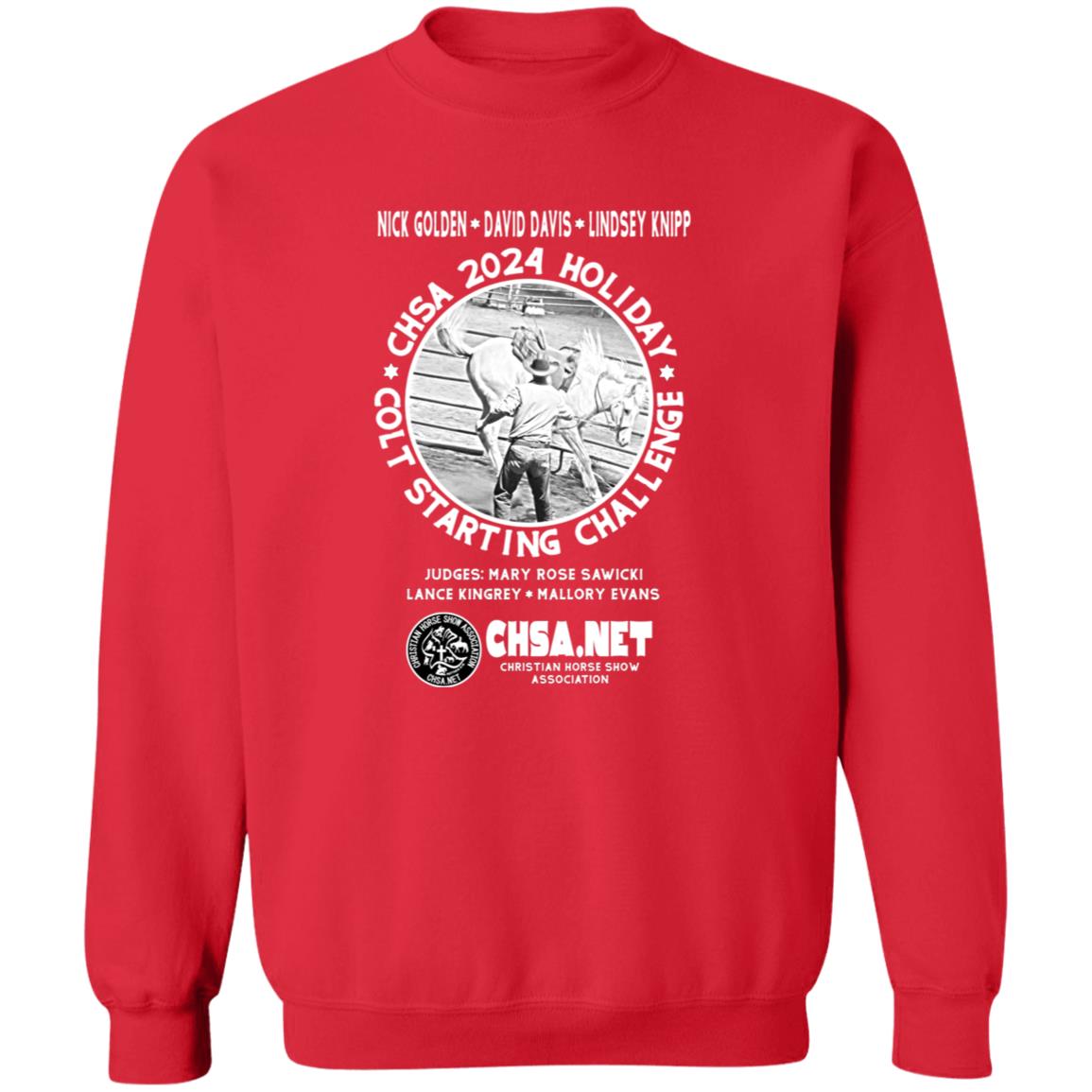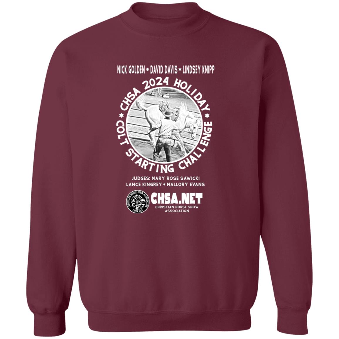 Take the chill off with our 2024 CHSA Holiday Colt Starting Event Sweatshirt. Perfect for autumn evenings around the campfire or an early morning run! Available in assorted colors!
