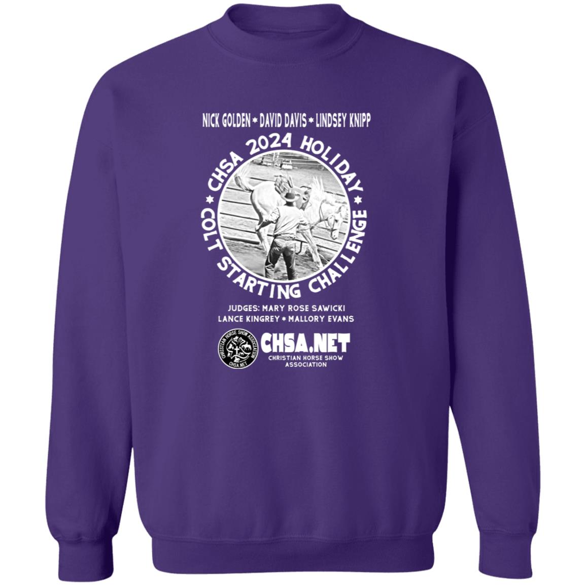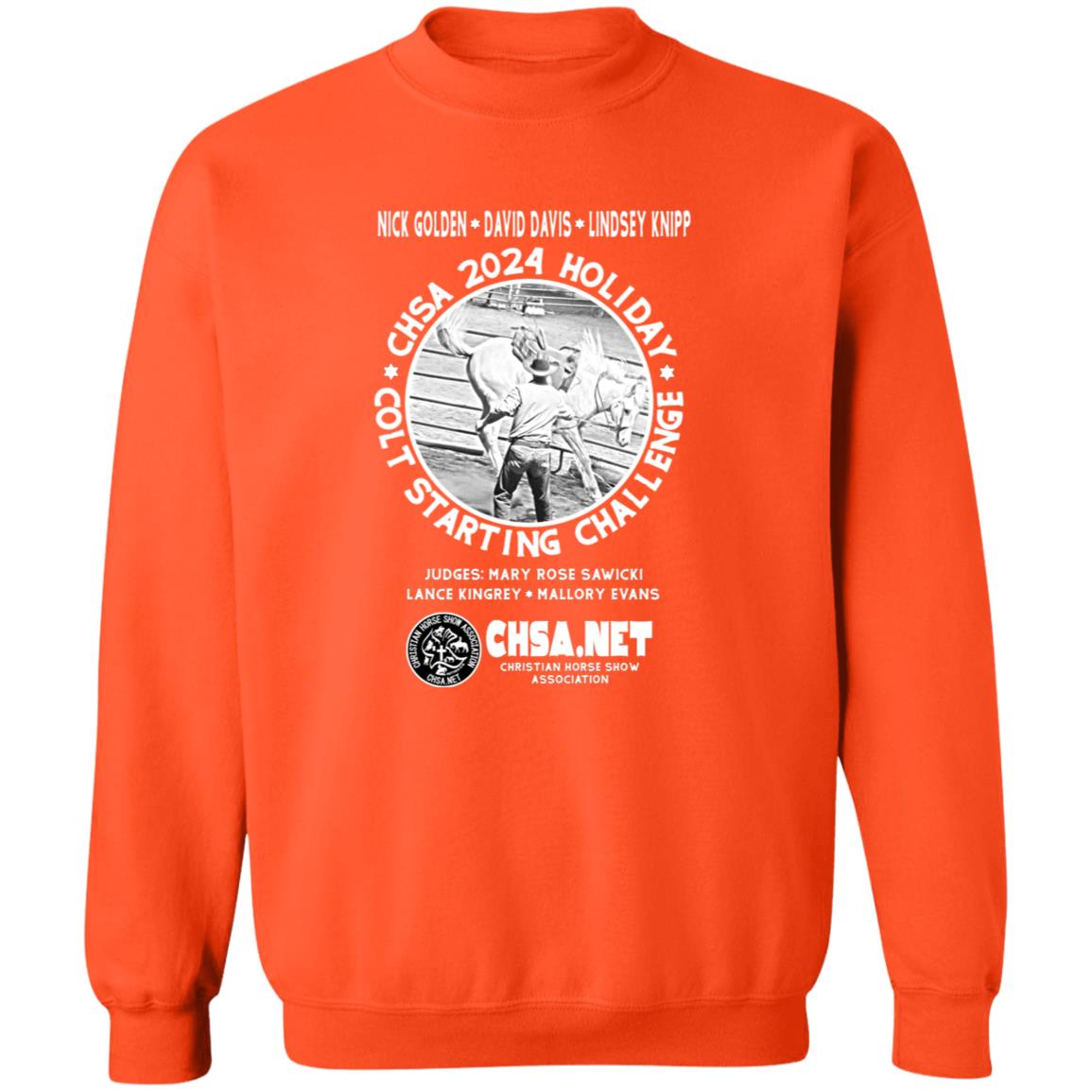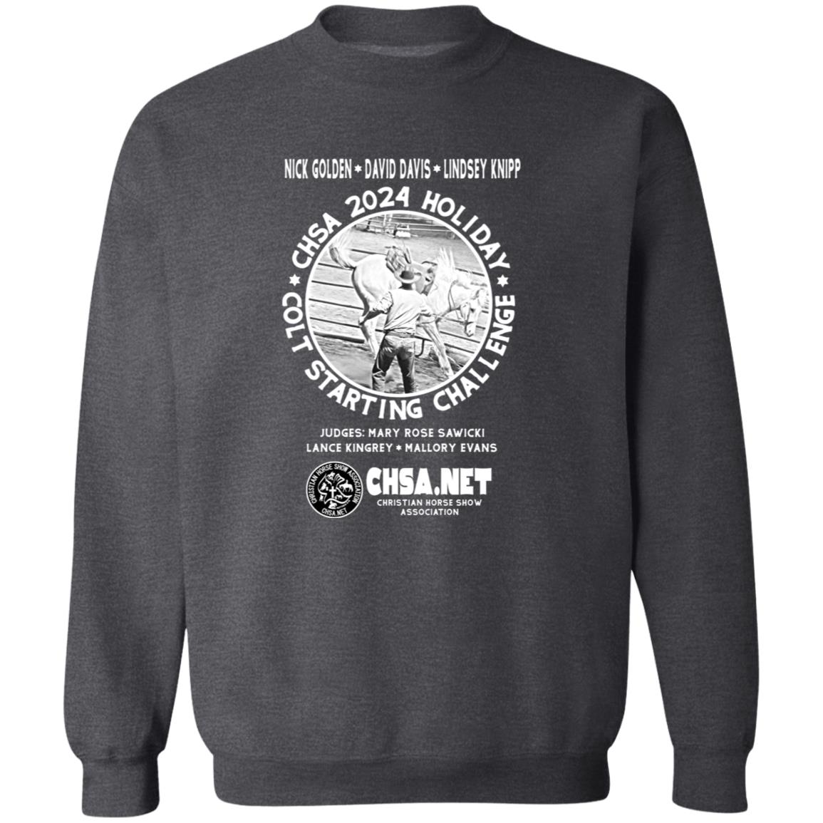 Take the chill off with our 2024 CHSA Holiday Colt Starting Event Sweatshirt. Perfect for autumn evenings around the campfire or an early morning run! Available in assorted colors!